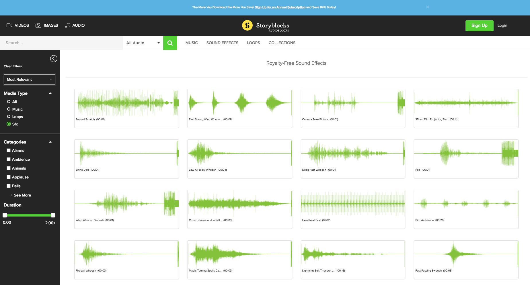 You've probably heard about Story Blocks for their video or stock footage, but they also have sounds and audio too! This is a subscription-based service, but you can try it for free for 7 days by signing up for their free trial.